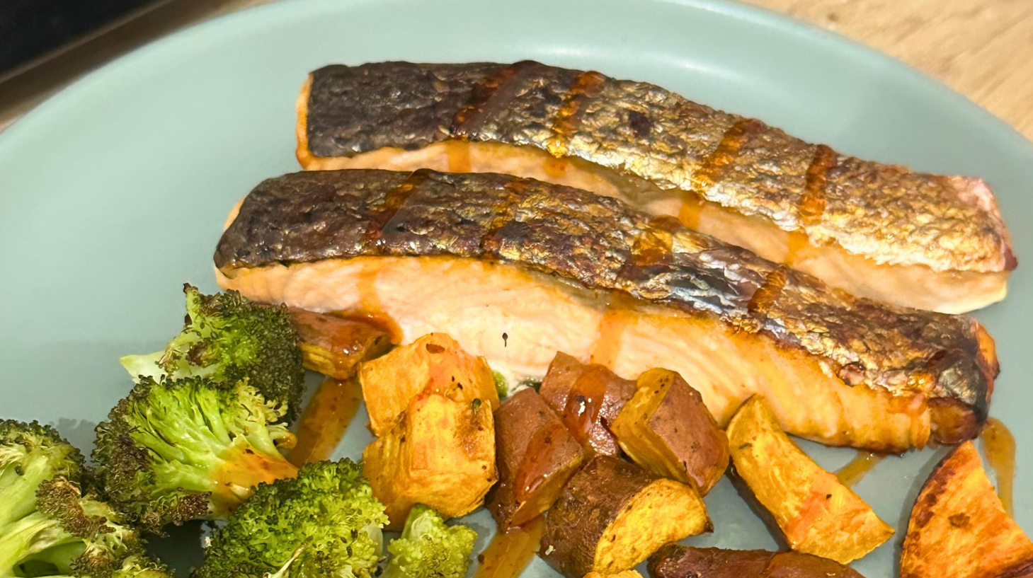 Dinner – Salmon fillet with charred broccoli, peas and sweet potato