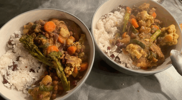 For the curry, I cut the chicken into generous chunks, seasoning it with a kick of medium spice curry powder, jerk seasoning, and a splash of soy sauce. I then mixed in a red onion and garlic, letting it marinate overnight to really soak up those flavours. The next day, I heated a pan with olive oil and a little brown sugar, cooking the chicken on each side for about five minutes. In went the vegetables—carrots, cauliflower, chickpeas, potatoes, and tenderstem broccoli—turning the dish into a deliciously rich stew-like curry. While that bubbled away, I cooked the rice with a bit of creamed coconut and kidney beans, making it a perfect pairing.