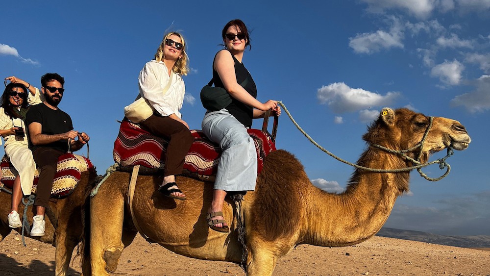 Beyond the food, one of the most magical experiences we had was an journey into the desert at sunset. Bouncing along on camels, we made our way to a small traditional camp where dinner was waiting under the stars. Sitting on rugs, surrounded by lanterns and silence, we shared a traditional Moroccan meal prepared with love – slow-cooked meats and fresh warm bread. It was surreal, humbling, and something I’ll never forget.