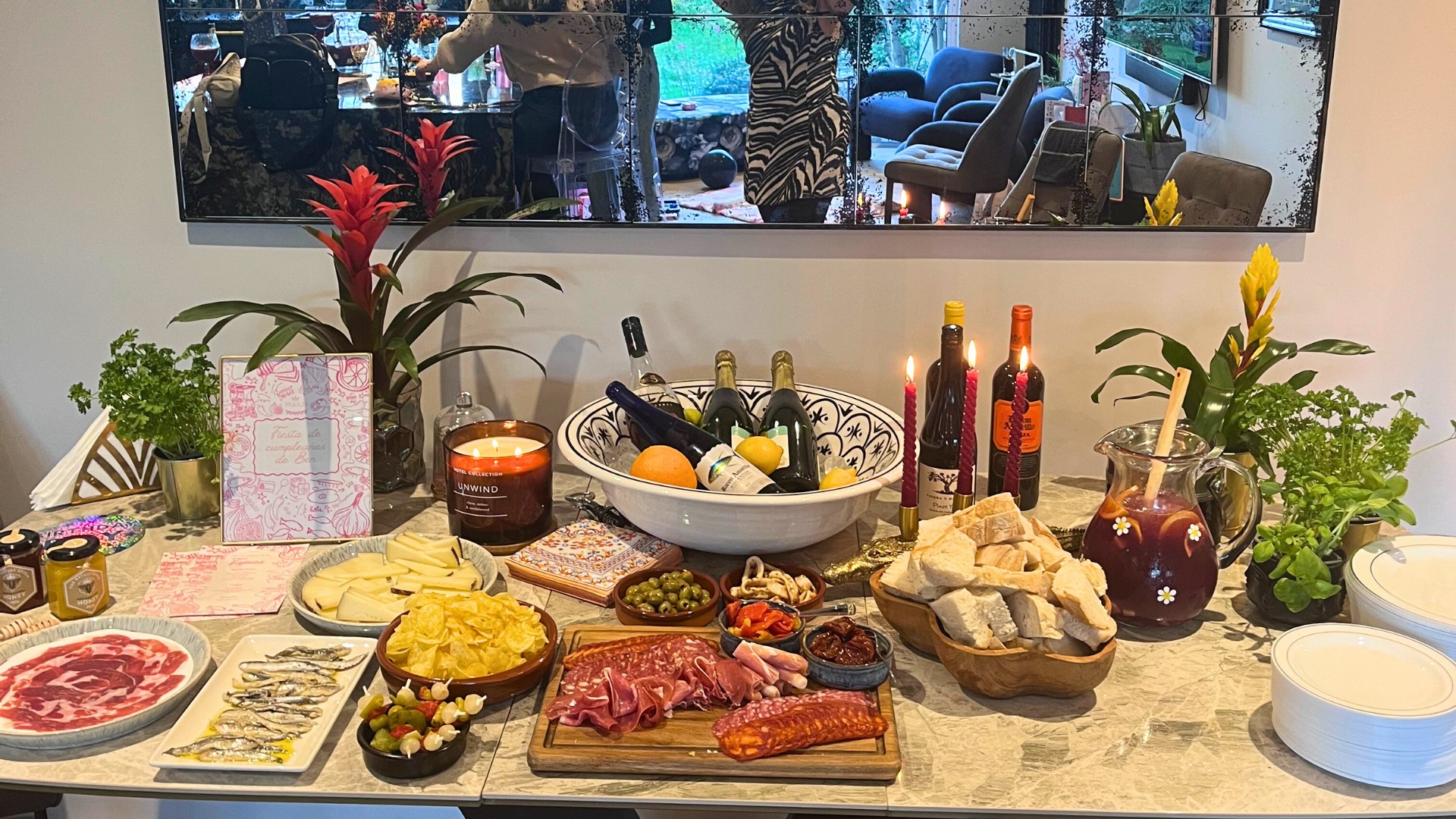 Guests began arriving from 4pm, so I couldn’t resist putting out a spread for them to graze on before the main feast began. Inspired by José, I attempted a vibrant food station setup with red and yellow accents, featuring a selection of Spanish meats, cheeses, antipasti, breads, and of course, boquerones.